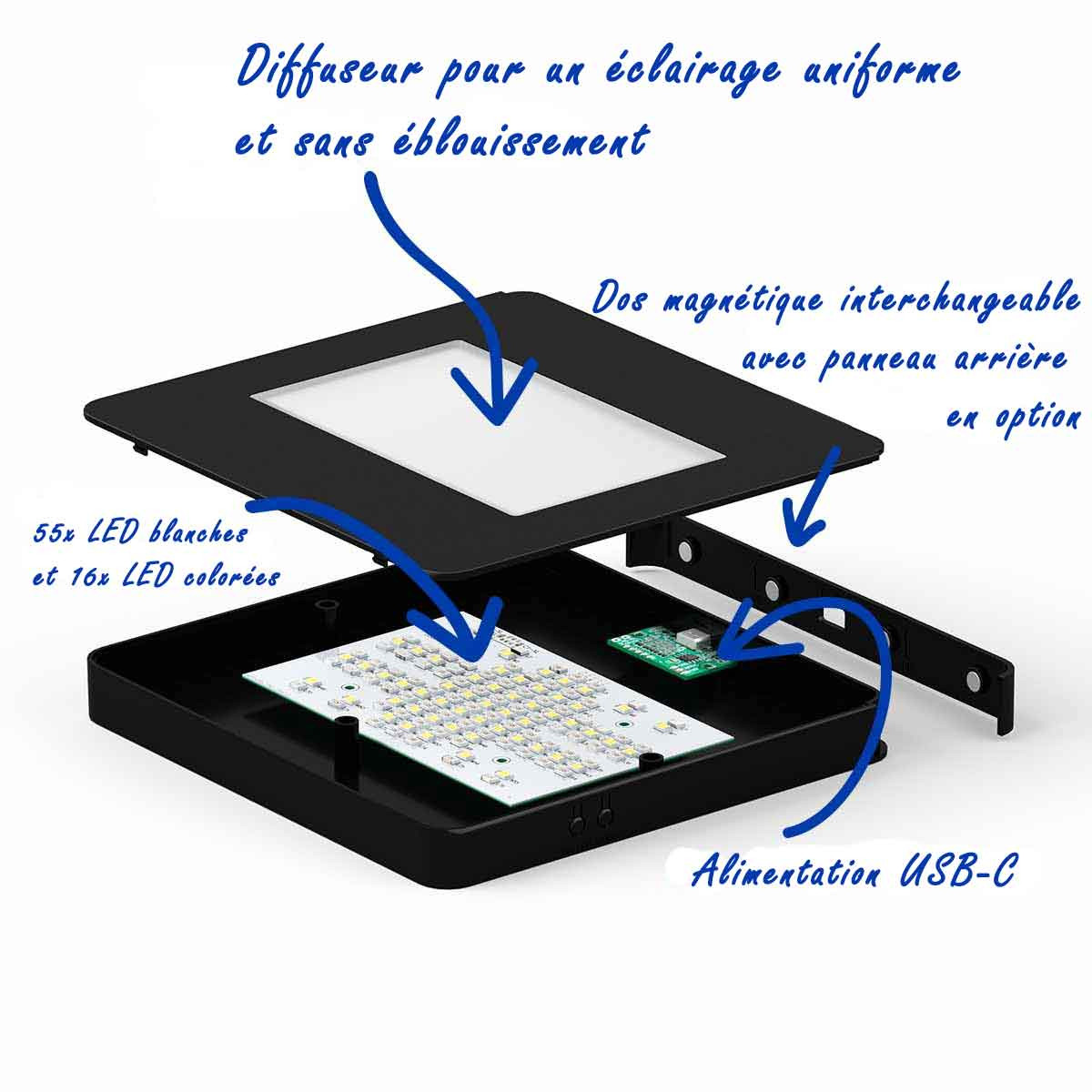 Note de sécurité : N'utilisez la base lumineuse qu'avec une alimentation USB fournissant 2 ampères !