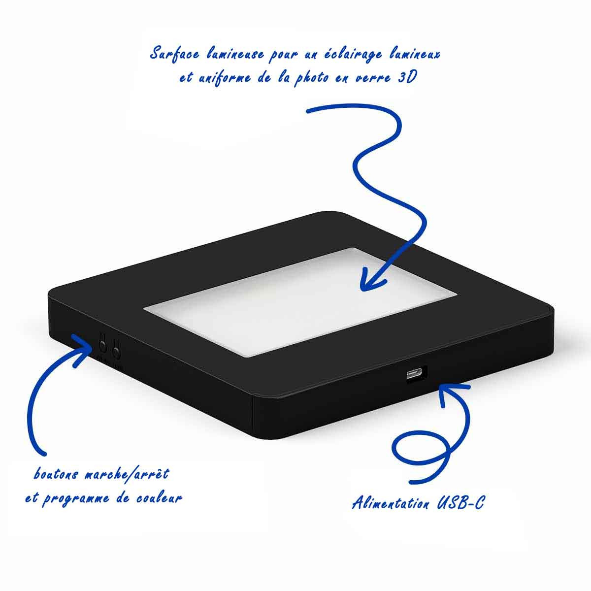 Note de sécurité : N'utilisez la base lumineuse qu'avec une alimentation USB fournissant 2 ampères !
